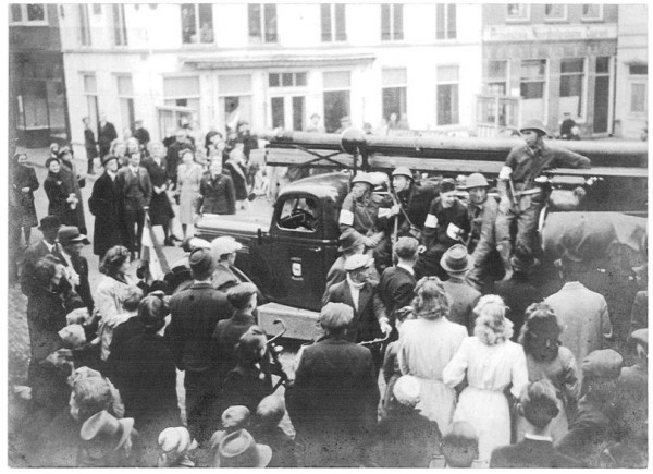 De "KP-ers" met de Chevrolet op de kaasmarkt in Purmerend mei 1945