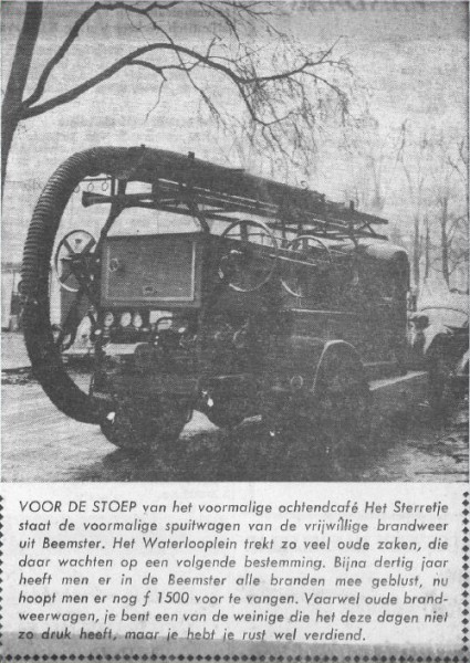Het gemeentebestuur van Beemster zorgde in 1938 er opnieuw voor dat de brandweer werd uitgerust met het modernste materiaal. De T-Ford uit 1924 werd vervangen door een Chevrolet auto-spuit van de firma Bikkers uit Rotterdam. De wagen werd op 27 oktober afgeleverd en tijdens de demonstratie trok men, mede door het geloei van de sirene, veel belangstelling. Met een capaciteit van 2000 tot 2500 liter per minuut kon zelfs met 8 stralen worden gespoten. De wagen was verder uitgerust met o.a. een schijnwerper voor de terreinverlichting en materiaalkasten. Andere uitbreidingen en verbeteringen waren een verwarmingsapparaat, 2 rookmaskers, een straalpijp met verstelbaar mondstuk, een bandenpomp. En dat alles voor het totaal bedrag van wel fl. 4.997,82. Op de laatste oefenavond in 1962 werd afscheid genomen van de Chevrolet. De wagen werd volledig onttakeld en uit een krantanartikel kwam naar voren dat deze mooie Chevie voor 1500 gulden te koop heeft gestaan op het Waterlooplein in Amsterdam.