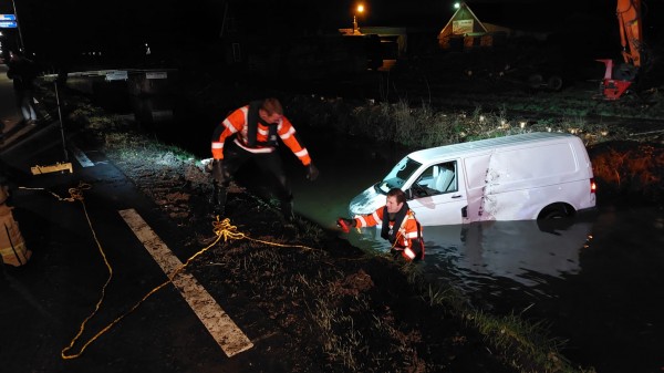 Auto te water langs de Middenweg thv N244. 2 personen zitten er nog in . Niet bekenld maar wilden niet nat worden.