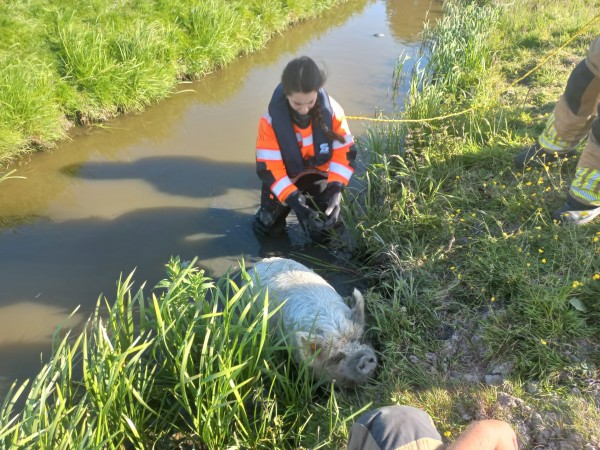 Dier in nood blijkt varken te water langs de Rijperweg. Ook dit dier weer op het droge gekregen al bleven sommige brandweermensen in de bagger achter.